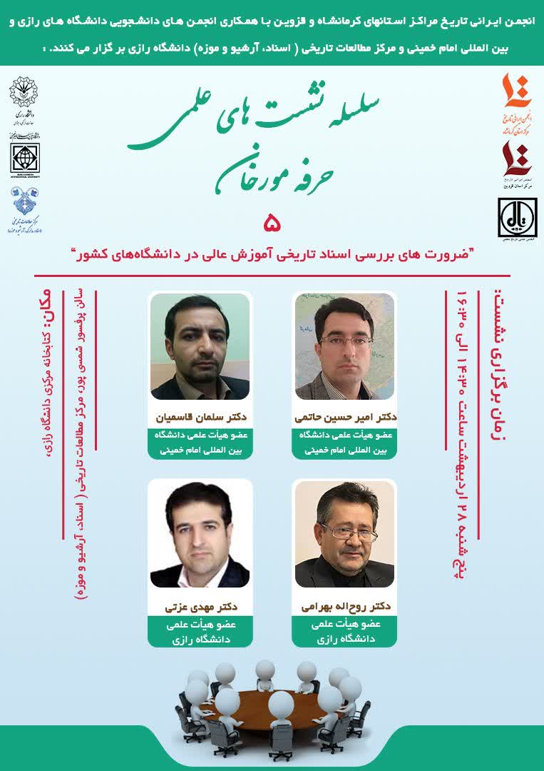 گروه تاریخ دانشگاه های رازی و انجمن ایرانی تاریخ مراکز استانهای کرمانشاه و قزوین با همکاری انجمنهای دانشجویی دانشگاههای رازی و بینالمللی امام خمینی(ره) و مرکز مطالعات تاریخی (اسناد، آرشیو و موزه) دانشگاه رازی با برگزاری نشست علمی ضرورتهای توجه به اسناد تاریخی آموزش عالی را تشریح کردند.